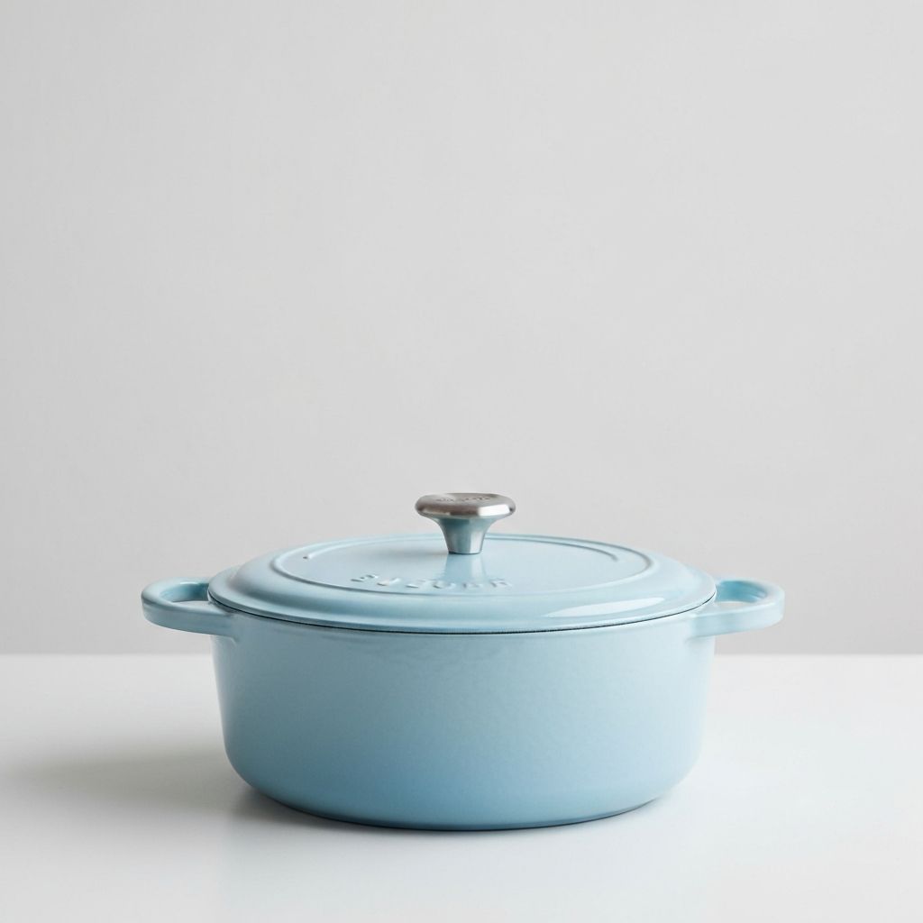 The centerpiece of any kitchen. Our signature dutch oven in Martha Blue is perfect for braising, roasting, baking bread, and so much more. The heavy cast iron construction provides exceptional heat retention and even cooking.